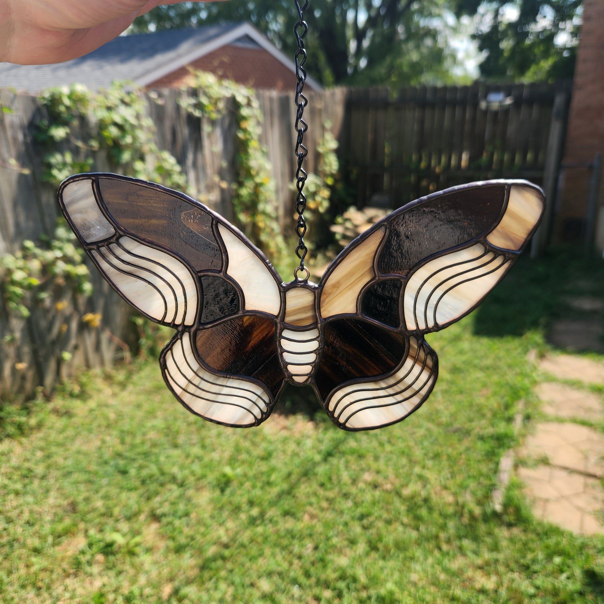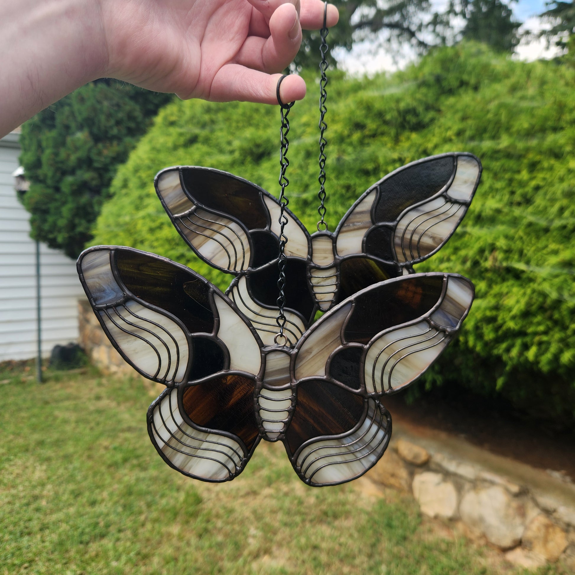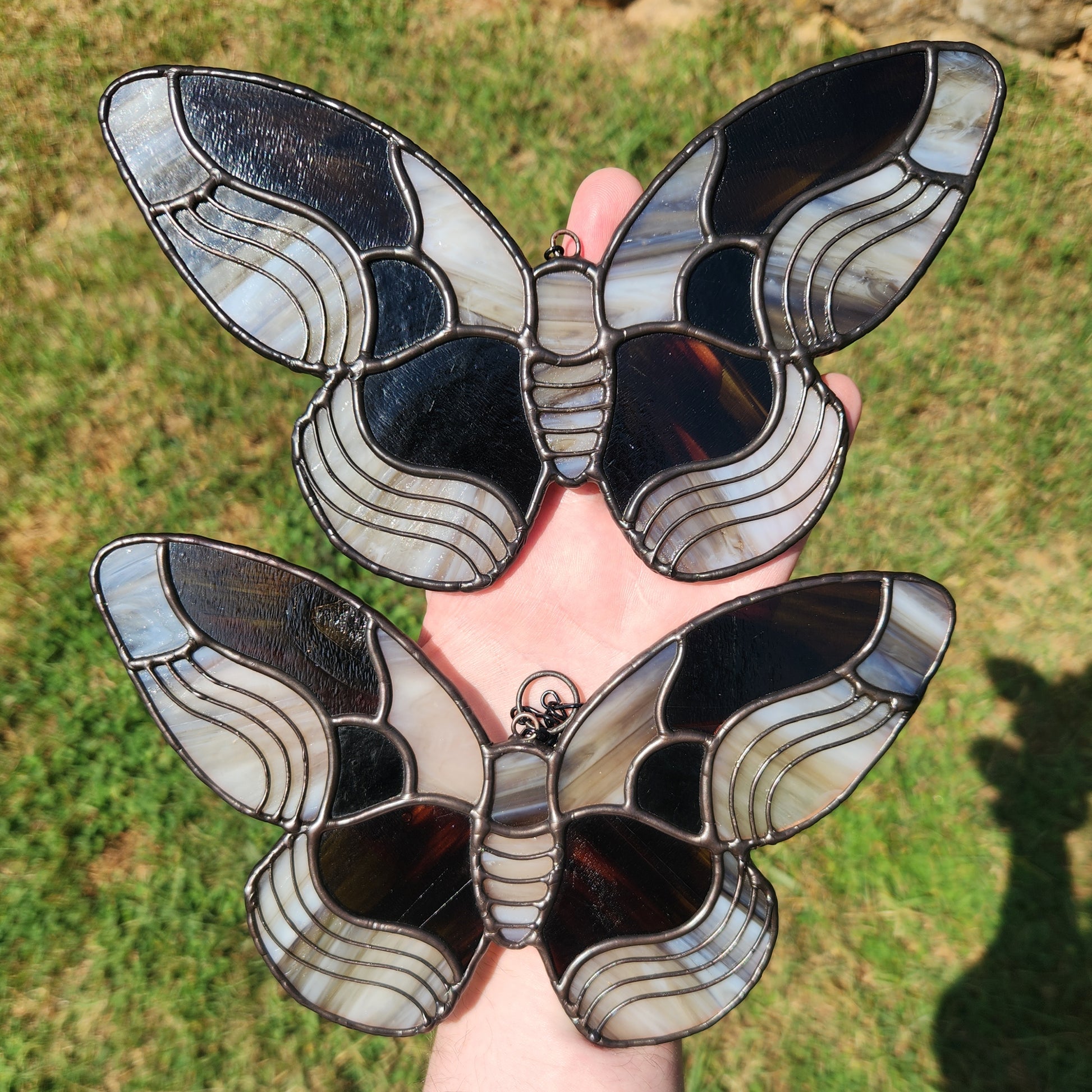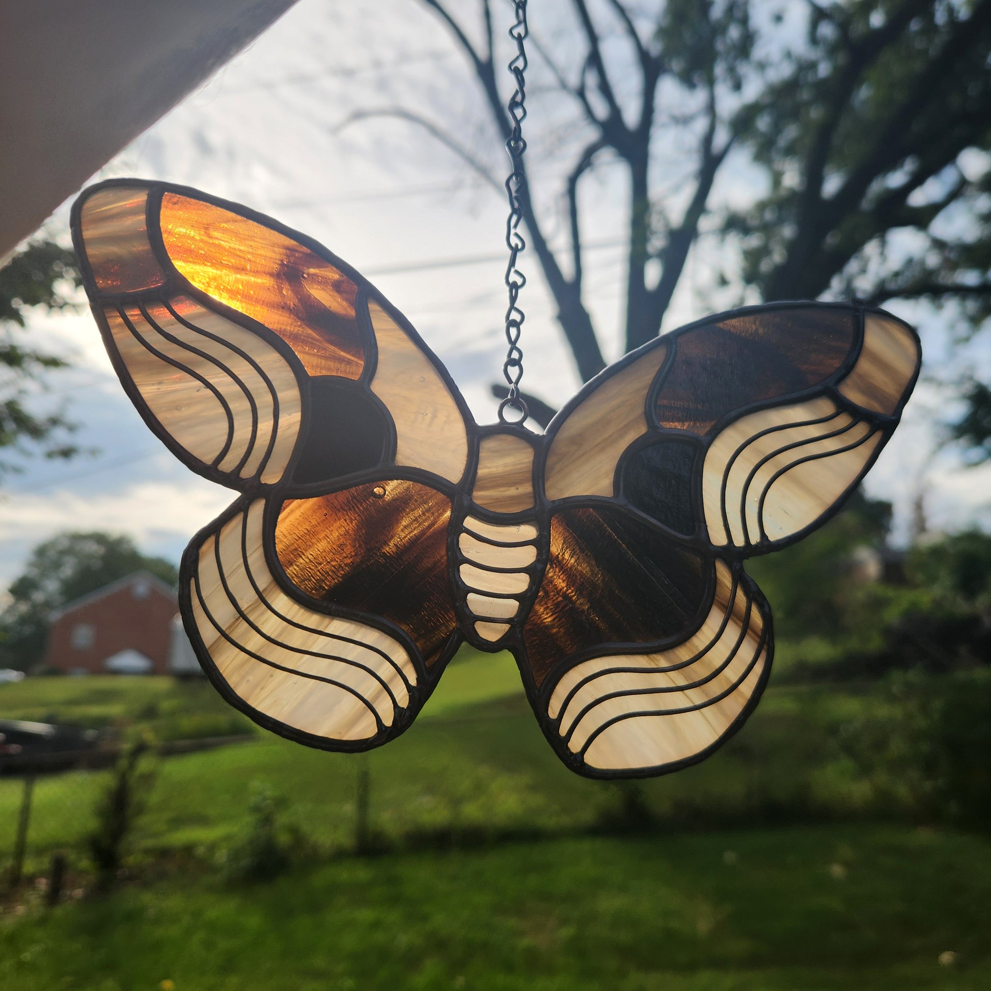 I recently picked up a preserved specimen for my own collection and was inspired to tackle it as a suncatcher. These detailed little moths are stunning in person and I am so pleased that my wirework here is able to capture a fraction of that visage. These look exceptional in a well-lit window that brings out the details in the mahogany glass. Two available, priced individually. 8.5"w x 5"h.