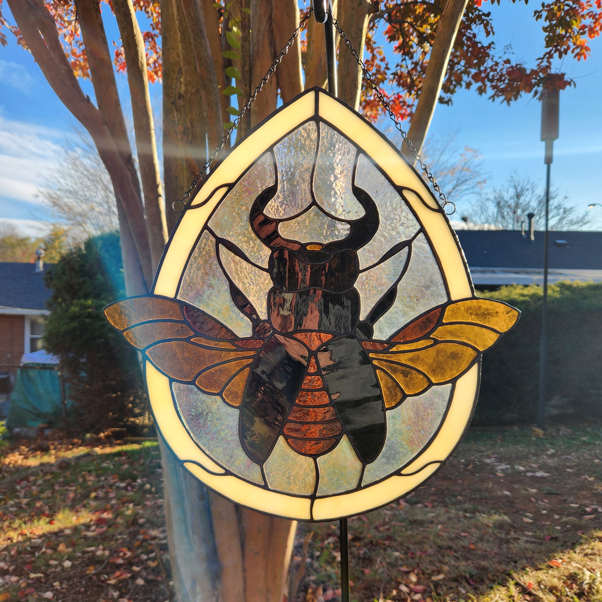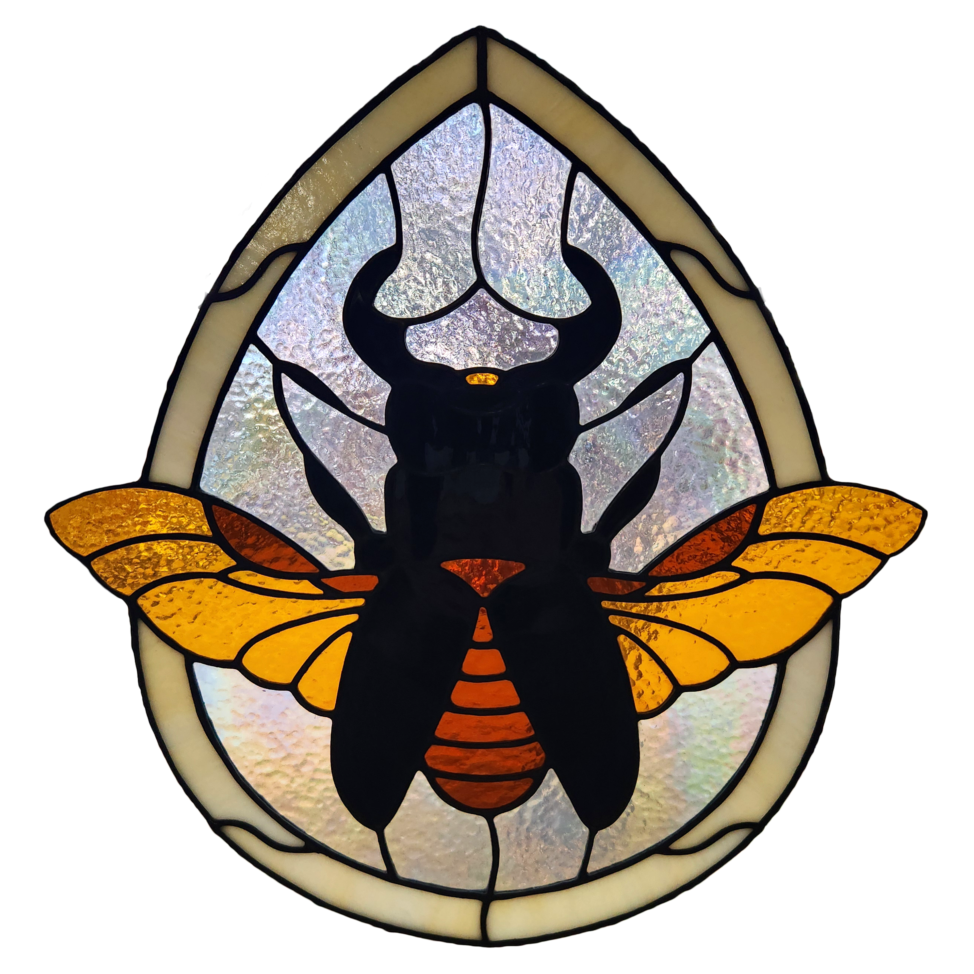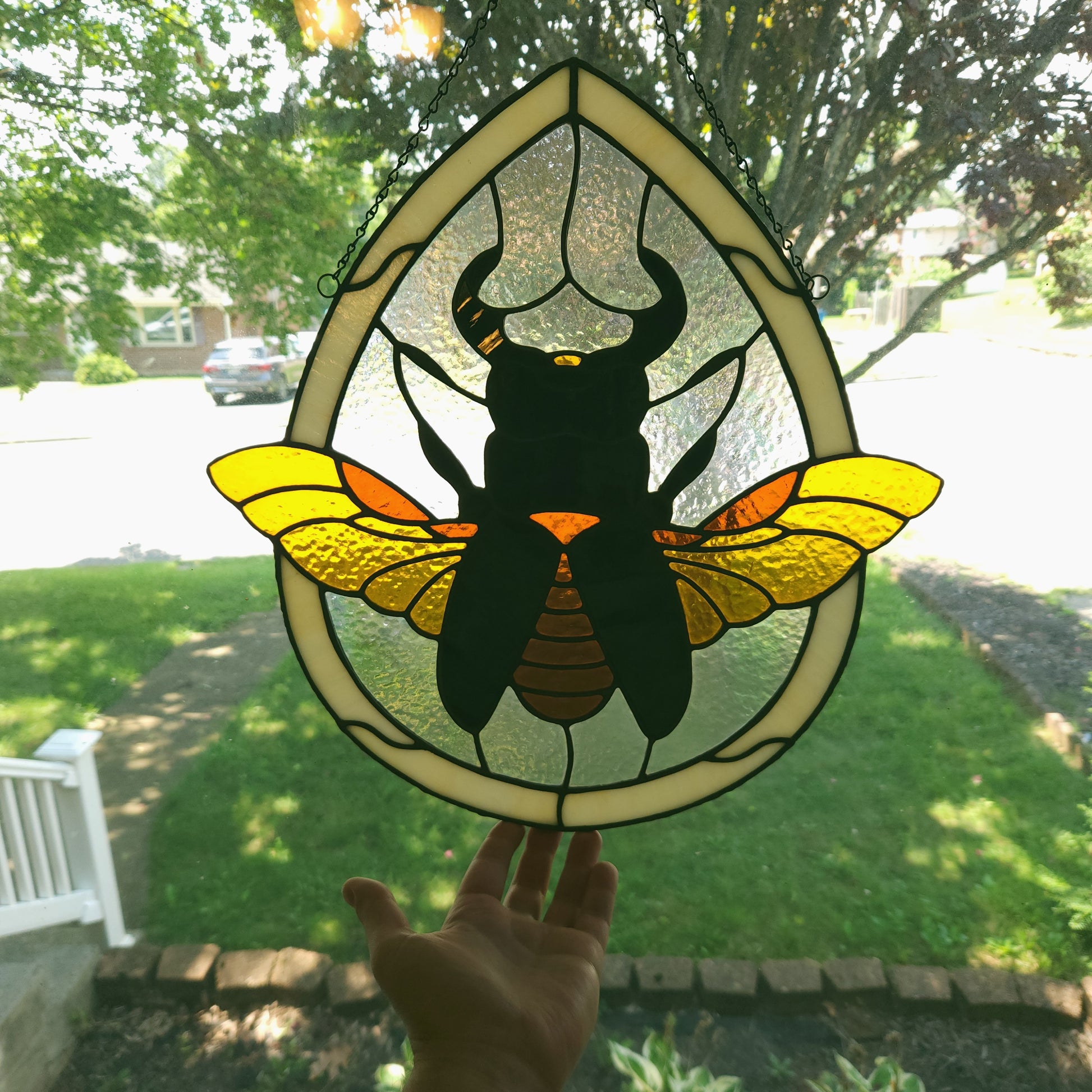 Giant Ox-headed stag beetle in 5 kinds of glass. The body of this beetle is an opaque, wavy onyx-black glass, contrasting beautifully with the rippled amber of its wings and the iridescent clear, cream-bordered drop of sap on which it sits. Framed in black patina solder and hung from a black chain. 16.5"w x 17"h