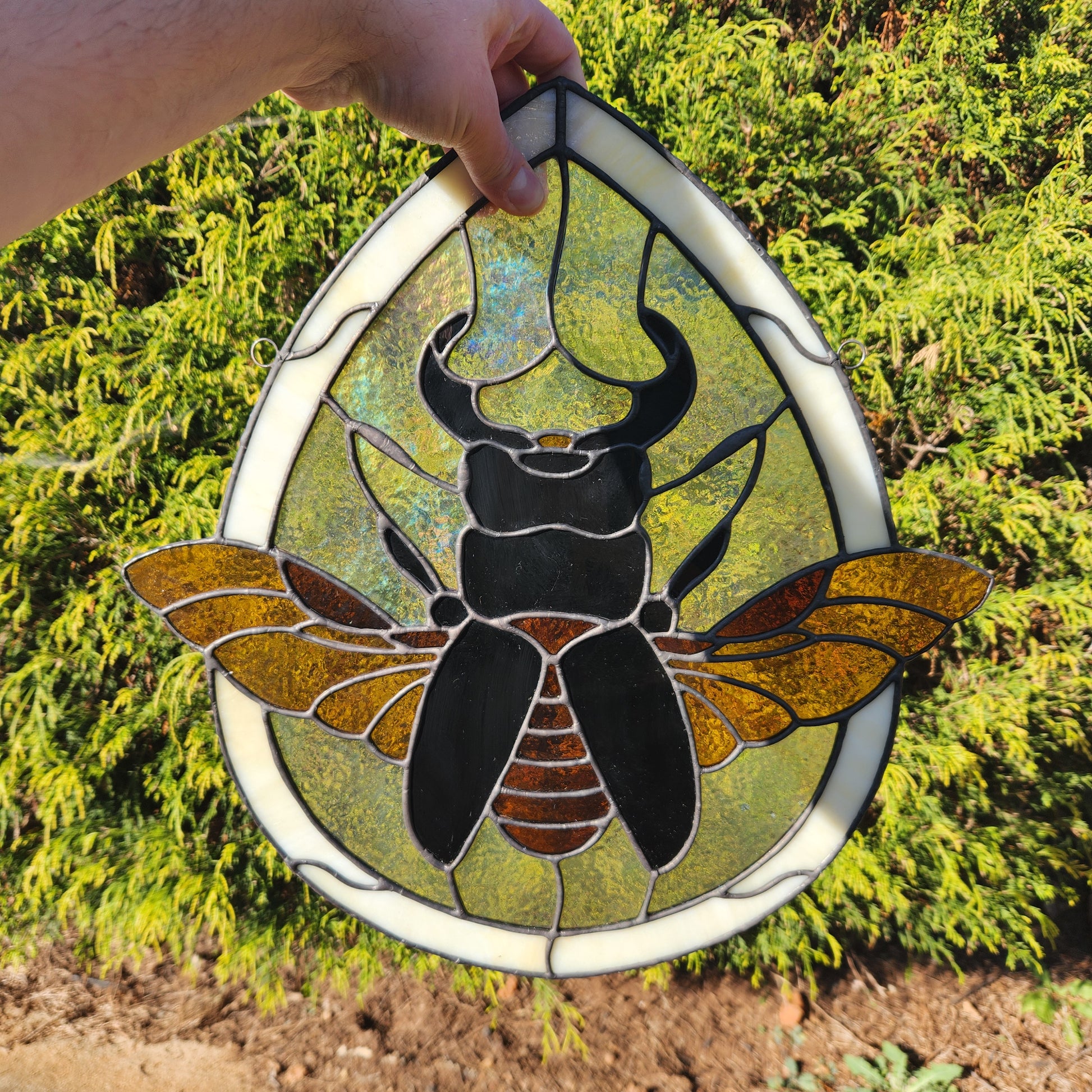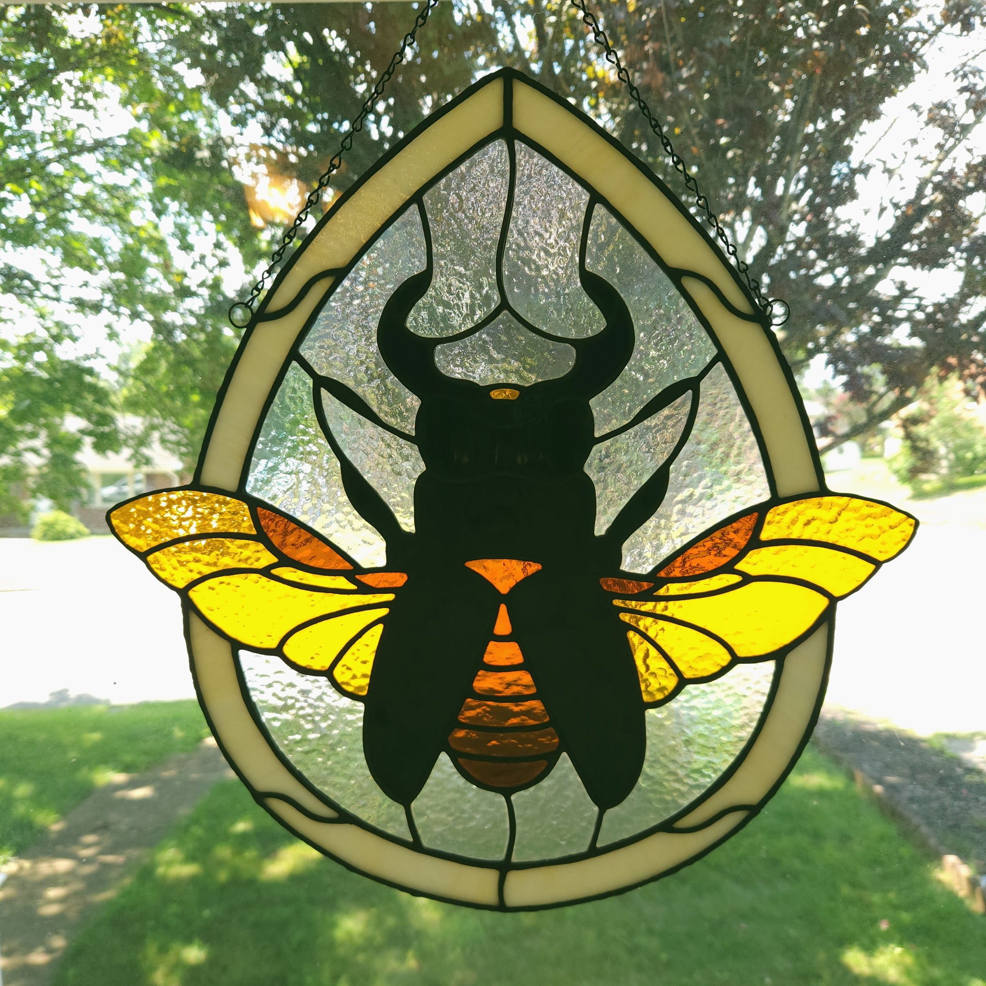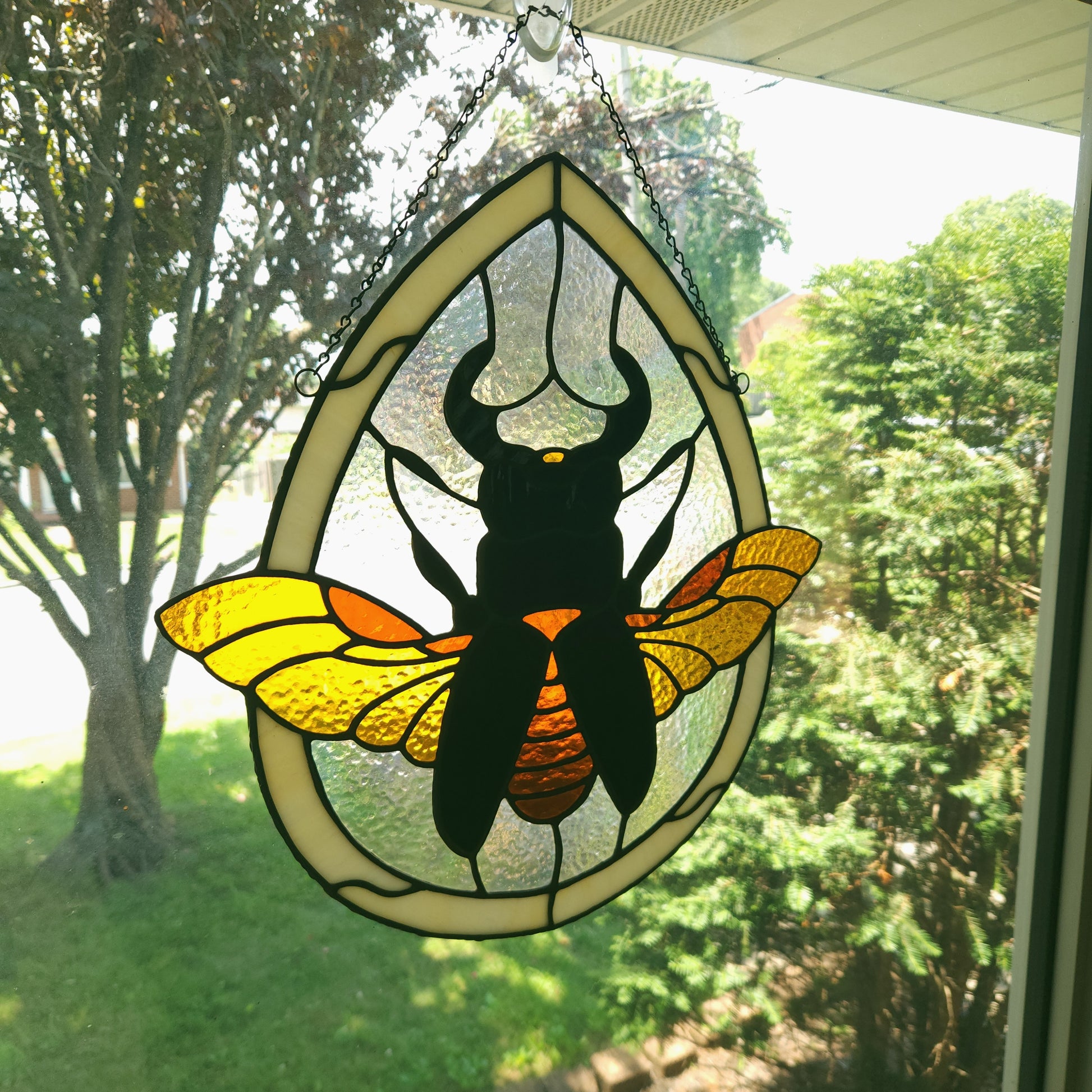 Giant Ox-headed stag beetle in 5 kinds of glass. The body of this beetle is an opaque, wavy onyx-black glass, contrasting beautifully with the rippled amber of its wings and the iridescent clear, cream-bordered drop of sap on which it sits. Framed in black patina solder and hung from a black chain. 16.5"w x 17"h