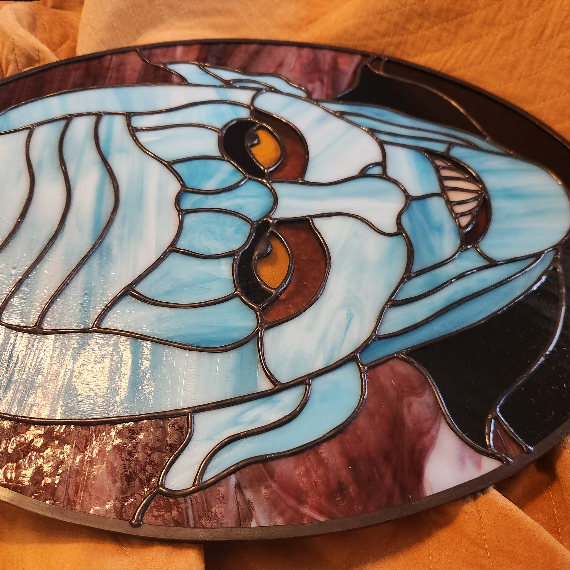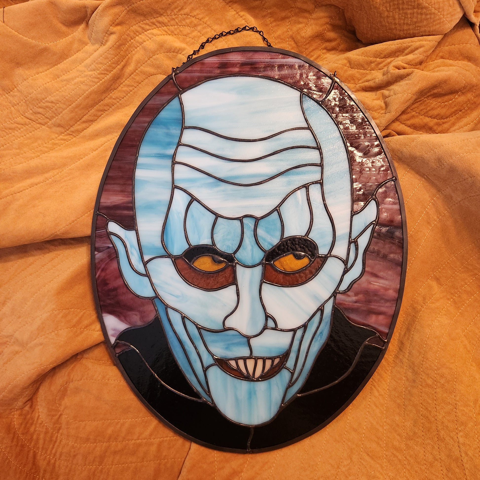 A stunning piece depicting the pale visage of an infamous vampiric menace. Various textures and translucencies of glass allow it to transform under different lighting conditions. It features a black patina and came surround for a clean finish and added rigidity. 14.5"w x 18.5"h