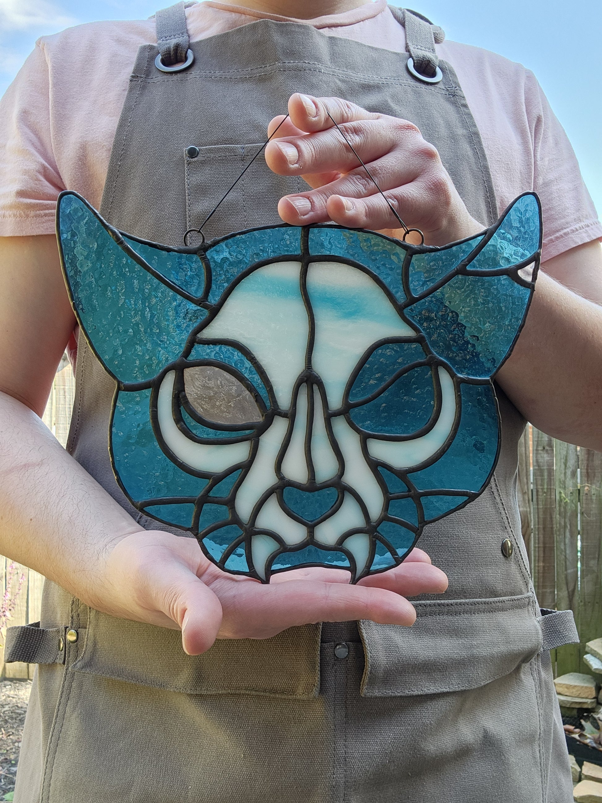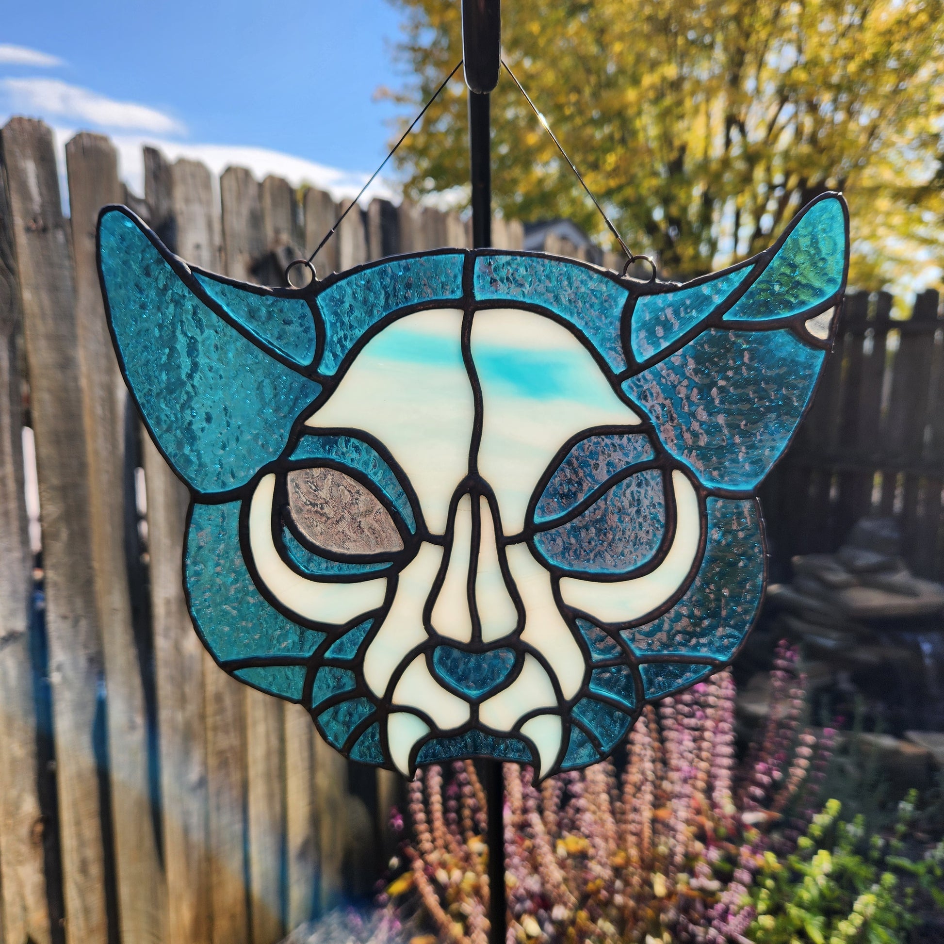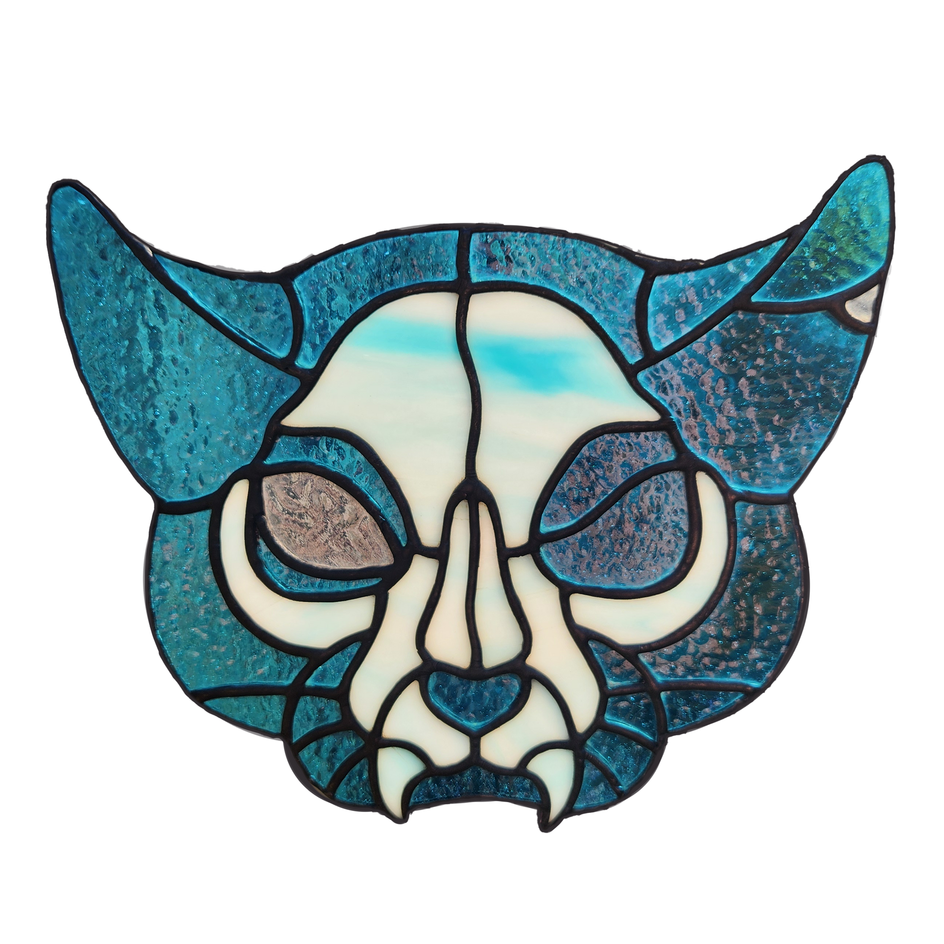 A ghostly feline in two colors. Inspired by a long lost friend. A bright transparent blue body and streaky cream and blue bones. Framed in black and hung from a black 20lb test line.